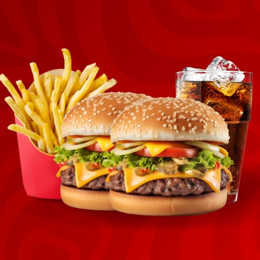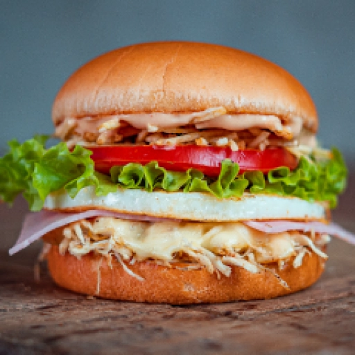 Pão, hamburguer, ovo, frango, queijo, presunto, alface, cebola, molho especial e catupiry ou cheddar.