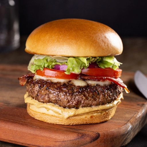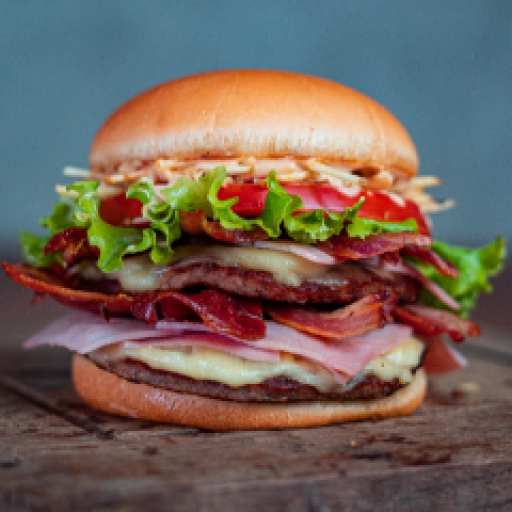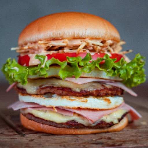 Pão, hamburguer, ovo, bacon, tomate, alface, cebola, queijo, presunto, molho especial e catupiry ou cheddar.